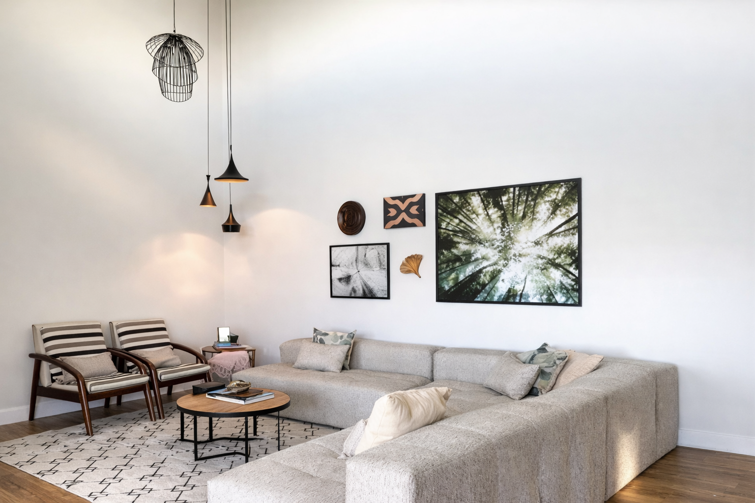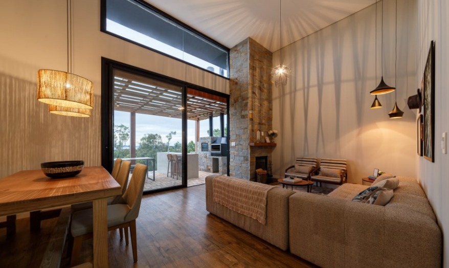 - Salas integradas com lareira e pé-direito dupla