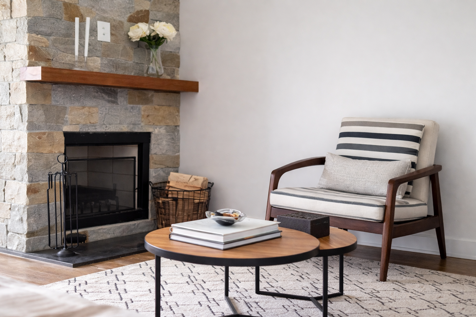 - Sala com lareira integrada à cozinha
