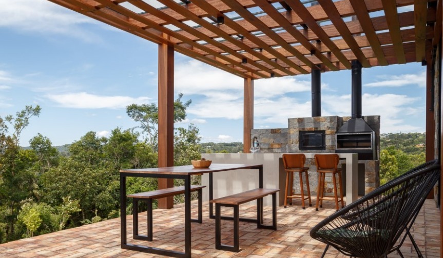 - Amplo terraço com área gourmet, forno e fogão a lenha, churrasqueira e cobertura em vidro temperado