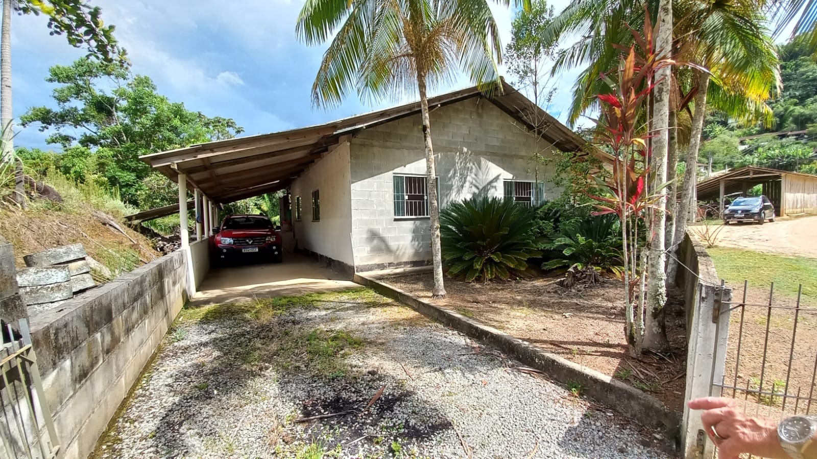 Dispõe de garagem ampla para até 4 veículos, além de estruturas como galinheiro e curral, ideal para uso rural ou criação de animais.